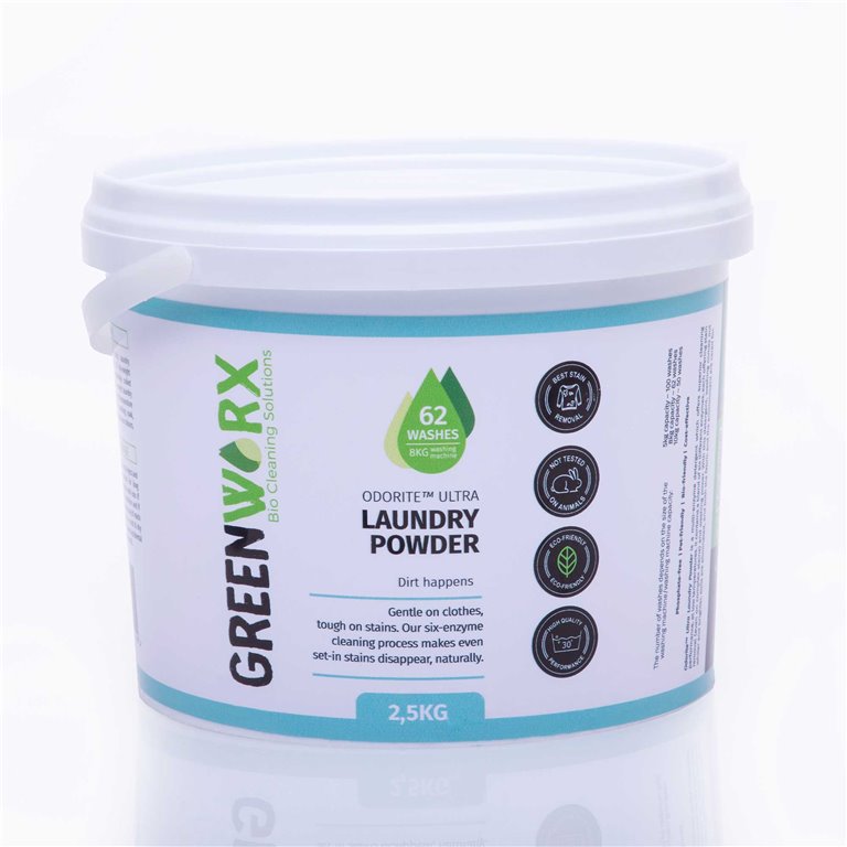 Odorite Ultra Laundry Powder blends powerful multi-enzyme action with probiotic richness to deliver brighter, cleaner laundry—even in cold water. With six stain-fighting enzymes and gentle, no-dust granules, it cares for your fabrics, your home, and the planet with every wash.